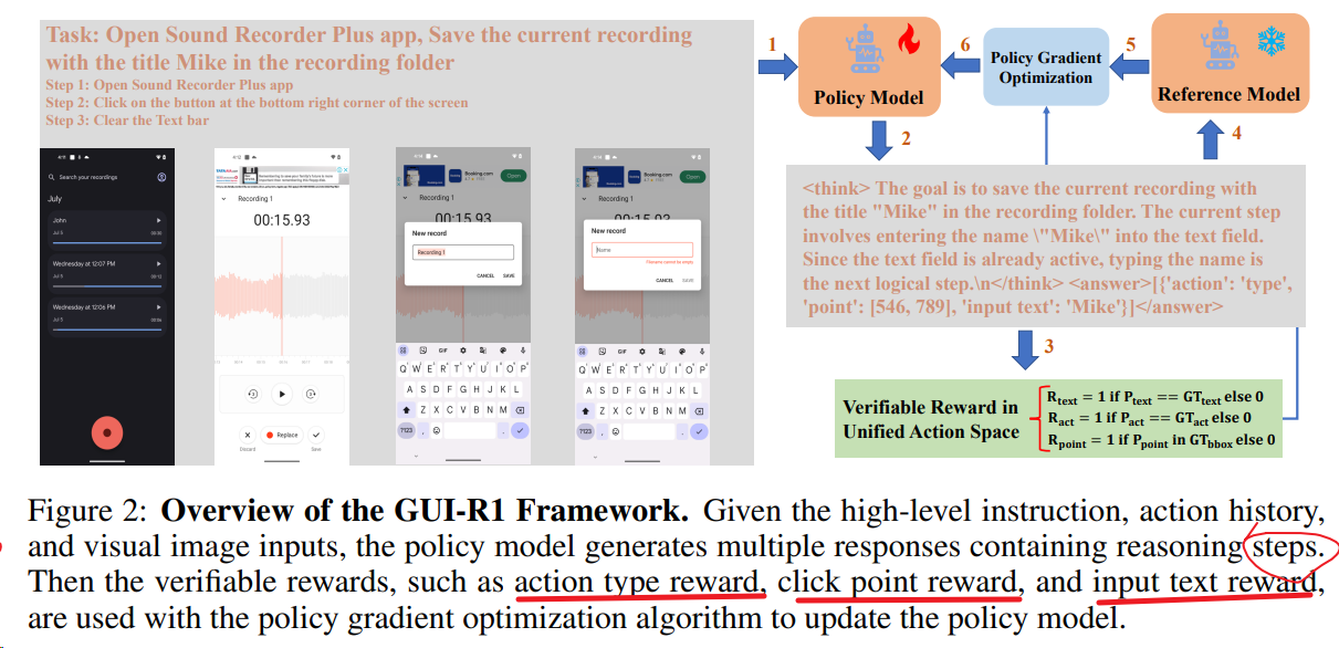 GUI-R1(中科院) 29 将动作类型、输入文本与点击坐标统一到标准化动作空间,提升MLLM在复杂真实GUI任务中的能力;