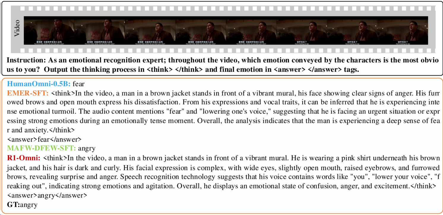 - R1-Omni (阿里通义)33 融合音频、视频与文本,通过RL提升情感识别能力,实现结构化社会情感推理;