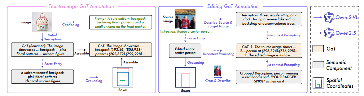 GoT 40 通过将多模态大语言模型的推理能力与视觉生成任务结合,提出了一种名为“生成思维链”(GoT)的新范式,实现了语义-空间联合推理驱动的可控图像生成与编辑。(图像坐标?)