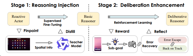 InfiGUI-R1 30 采用两阶段RL框架,推动GUI智能体从“反应式执行”迈向“深思熟虑式推理”,通过子目标引导与反思修正增强规划与错误恢复能力。第一阶段是 “推理注入”,通过空间推理蒸馏技术,将教师模型的空间推理能力传递给 MLLMs,使其能够在行为生成之前,整合 GUI 的视觉空间信息与逻辑推理。第二阶段是 “推理增强”,利用强化学习(RL)进一步细化基础推理者,引入了两种关键的技术:子目标指导和错误恢复场景构建,以提高代理的规划能力和自我纠正能力。最终实现参数量以小打大。