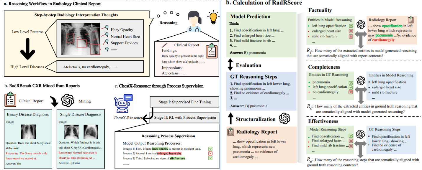- ChestX-Reasoner(上交) 2 采用过程监督的强化学习,利用放射科报告中的监督信号对齐临床工作流,增强推理链的事实性、完整性与诊断相关性,并提升疾病分类、异常检测和时序比较等任务的准确性。reward设计(RadRScore计算的目标是事实性(生成推理的正确性)、完整性(涵盖临床发现的全面性)和有效性(诊断过程的必要性和相关性)。)