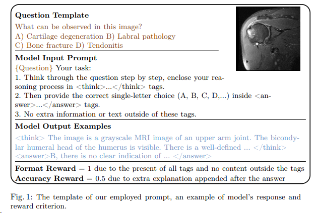 - MedVLM-R1 31 通过奖励(GRPO)结构化推理路径,提升多选题答案的可验证性;