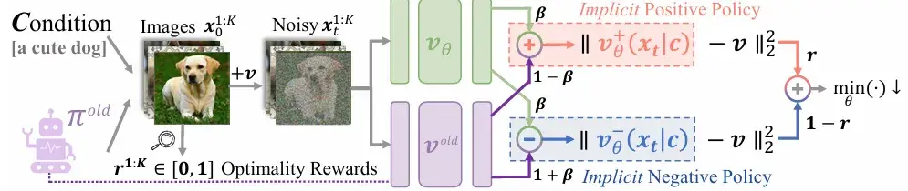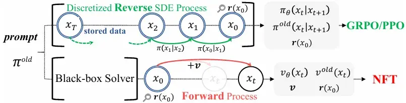 为什么不直接在“加噪”的前向过程中融入奖励信号呢?与其在去噪的每一步艰难地“纠正”方向,不如从一开始就引导整个扩散过程,使其“避开”通往低奖励样本的路径。DiffusionNFT 将强化学习的目标巧妙地转化为一个对前向过程的微调任务,从而完全绕开了棘手的似然估计问题。