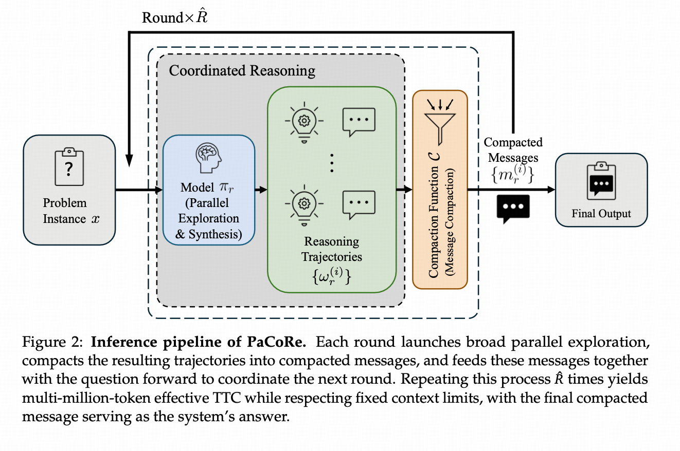 - 推理管道通过协调并行探索来大规模扩展测试时计算(TTC),远远超出顺序推理的限制,同时独立于上下文约束。具体来说每一轮推理都会启动广泛的并行探索,将产生的轨迹压缩为紧凑的消息,并将这些消息与问题一起传递给模型,以协调下一轮。重复这个过程R次,在尊重固定上下文限制的同时,产生数百万个令牌的有效TTC,最终的紧凑消息作为系统的答案