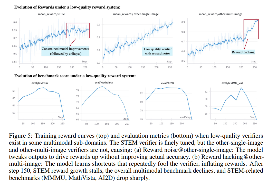 奖励设计的不好,往往会出现 Reward hacking:奖励上升,但评测集分数下降50